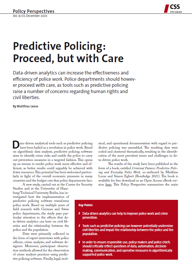 Leese M (2020) Predictive Policing: Proceed, but with Care. CSS Policy Perspectives 8(14).